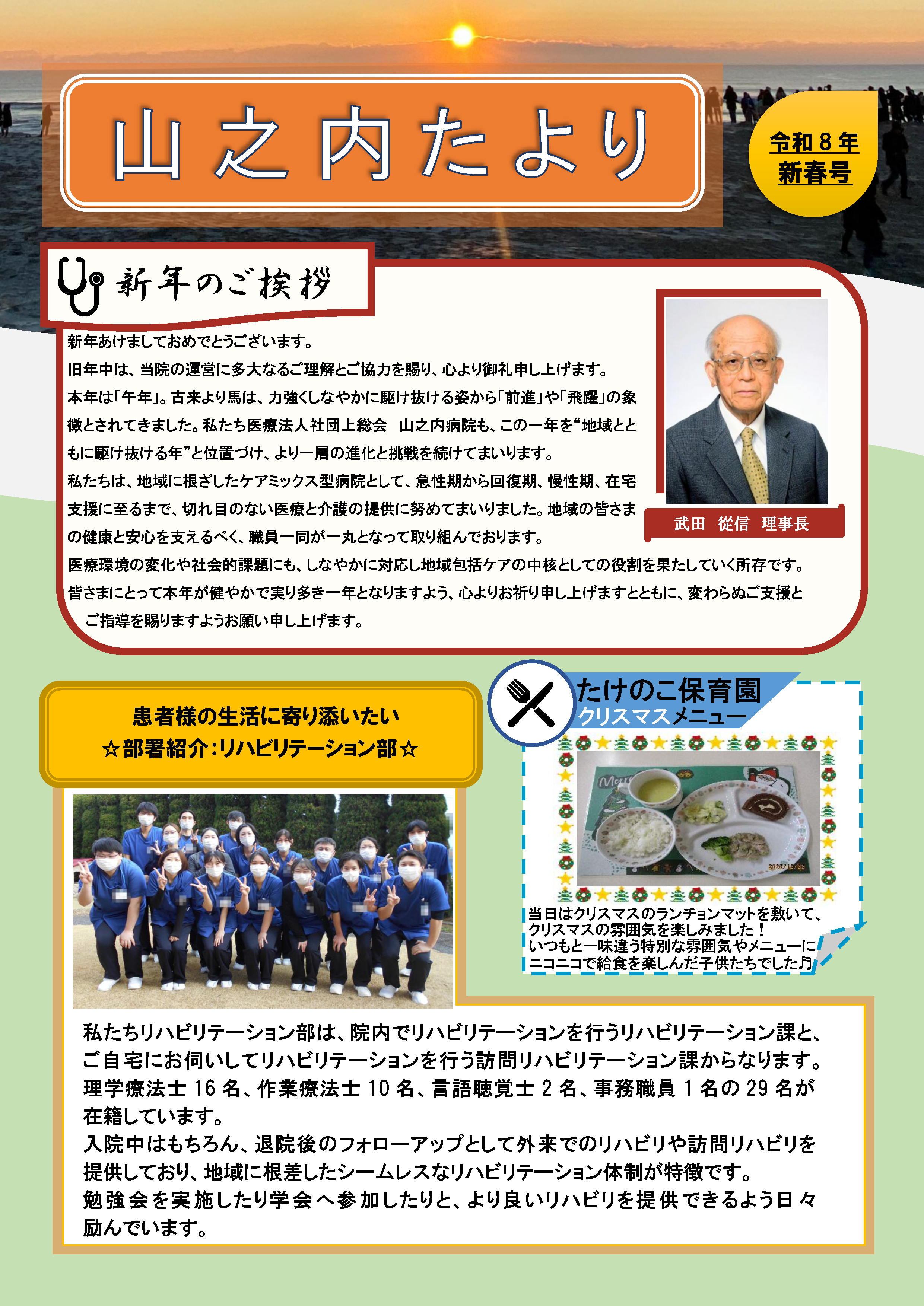 広報誌『山之内たより』令和8年新春号を発行しました 2026年1月19日 事務局からのお知らせ 総務課 山之内病院広報誌「山之内たより」令和8年新春号を掲載しました。 PDFはこちら山之内病院広報誌「山之内たより」令和8年新春号 back number (PDF) 山之内病院広報誌「山之内たより」令和7年春・夏号